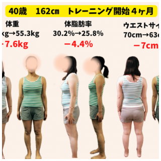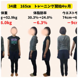 トレーニング開始時 → 4ヶ月後 体重62.9キロ → 55.3キロ(-7.6キロ) 体脂肪率30.2% → 25.8%(-4.4%) ウエスト70cm → 63cm(-7cm) Q なぜトレーニングを始めようと思いましたか? きっかけは先...