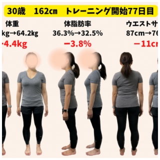 トレーニング開始77日 体重68.6キロ → 64.2キロ(-4.4キロ) 体脂肪率36.3% → 32.5%(-3.8%) ウエストサイズ87cm → 76cm(-11cm) Q なぜトレーニングを始めようと思いましたか? 産後体験が戻ら...
