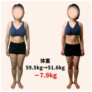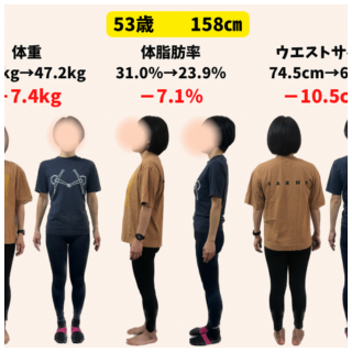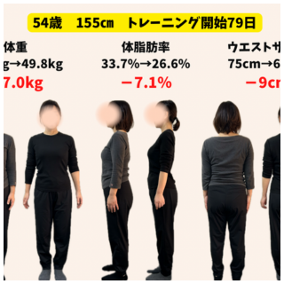 体重 54.6キロ → 47.2キロ(-7.4キロ) 体脂肪率 31.0% → 23.9%(-7.1%) ウエストサイズ 74.5cm → 64cm(-10.5cm) Q なぜトレーニングを始めようと思いましたか? コロナ禍でほぼ外出せず、...
