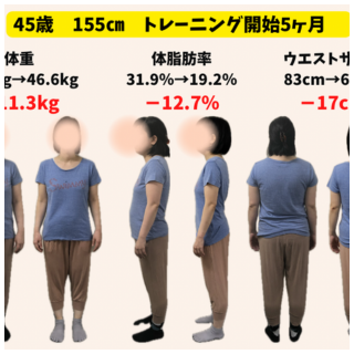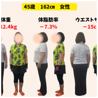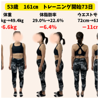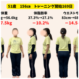 体重50.9キロ→44.3キロ(-6.6キロ) 体脂肪率31.4%→24.3%(-7.1%) ウエストサイズ70cm→61cm(-9cm) Q なぜトレーニングを始めようと思いましたか? 体重の増加、膝痛を実感し本格的にダイエットをしなけれ...