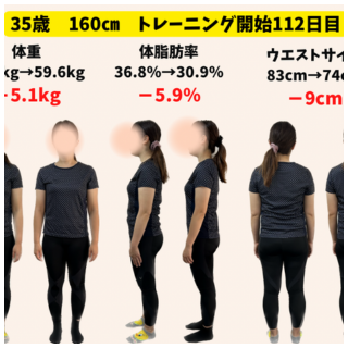 トレーニング開始112日目 体重 64.7キロ → 59.6キロ(-5.1キロ) 体脂肪率 36.8% → 30.9%(-5.9%) ウエストサイズ 83cm → 74cm(-9cm) Q なぜトレーニングを始めようと思いましたか? 産後、...