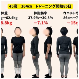 トレーニング開始時 → 99日目 体重83.0キロ → 75.2キロ(-7.8キロ)体脂肪率46.1% → 41.6%(-4.5%)ウエスト98cm → 88cm(-10cm) Q なぜトレーニングを始めようと思いましたか?20代の頃か...