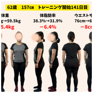 トレーニング開始時 → 141日目 体重64.9㎏ → 59.5㎏(-5.4㎏)体脂肪率38.3% → 31.9%(-6.4%)ウエスト76cm → 68cm(-8cm) Q なぜトレーニングを始めようと思いましたか?長年続けていたスポーツ...