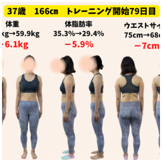 トレーニング開始79日目 体重66.0キロ → 59.9キロ(-6.1キロ) 体脂肪率35.3% → 29.4%(-5.9%) ウエストサイズ75cm → 68cm(-7cm) Q なぜトレーニングを始めようと思いましたか? 前職の6年間で...