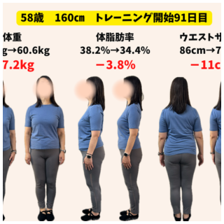 トレーニング開始時 → 91日目 体重67.8㎏ → 60.6㎏(-7.2㎏) 体脂肪率38.2% → 34.4%(-3.8%) ウエスト86cm → 75cm(-11cm) Q なぜトレーニングを始めようと思いましたか? 多...