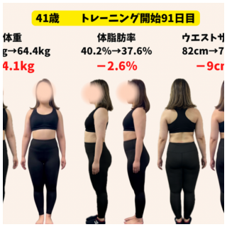 トレーニング開始時 → 91日目 体重68.5kg → 64.4kg(-4.1kg) 体脂肪率40.2% → 37.6%(-2.6%) ウエスト82cm → 73cm(-9cm) Q なぜトレーニングを始めようと思いましたか? 毎年服のサイ...