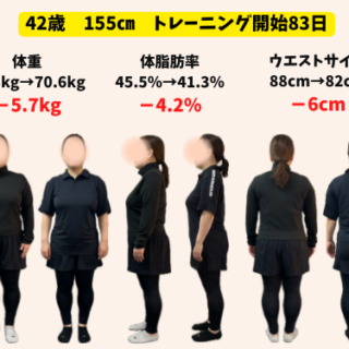トレーニング開始時 → 83日目 体重76.3㎏ → 70.6㎏(-5.7㎏) 体脂肪率45.5% → 41.3%(-4.2%) ウエスト88cm → 82cm(-6cm) Q なぜトレーニングを始めようと思いましたか? 体重が過去最高にな...