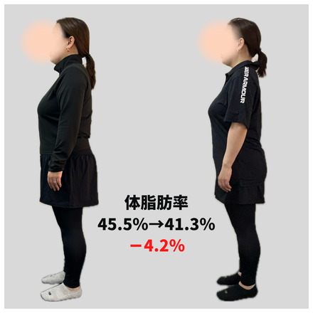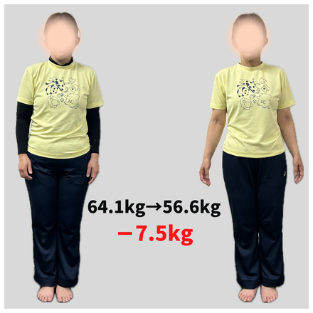 体重50.9キロ→44.3キロ(-6.6キロ) 体脂肪率31.4%→24.3%(-7.1%) ウエストサイズ70cm→61cm(-9cm) Q なぜトレーニングを始めようと思いましたか? 体重の増加、膝痛を実感し本格的にダイエットをしなけれ...