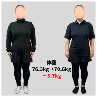 体重 54.6キロ → 47.2キロ(-7.4キロ) 体脂肪率 31.0% → 23.9%(-7.1%) ウエストサイズ 74.5cm → 64cm(-10.5cm) Q なぜトレーニングを始めようと思いましたか? コロナ禍でほぼ外出せず、...