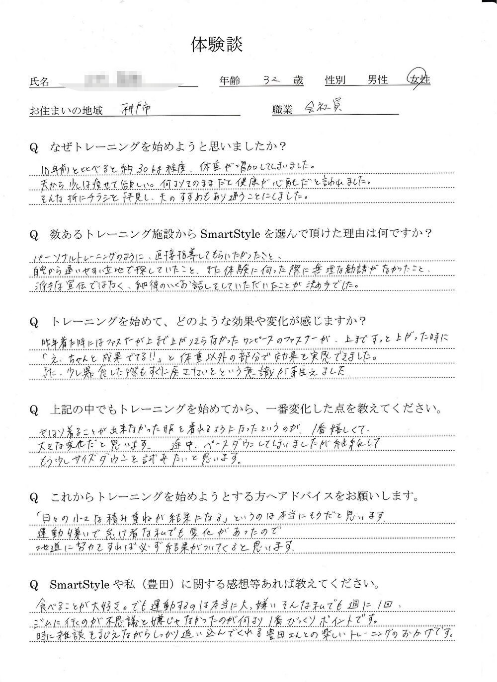 着ることが出来なかった服を着れるようになったというのが、1番婚しくて、大きな変化だと思います。(93日途中経過-5.8㎏) N.O様 神戸市中央区 32歳